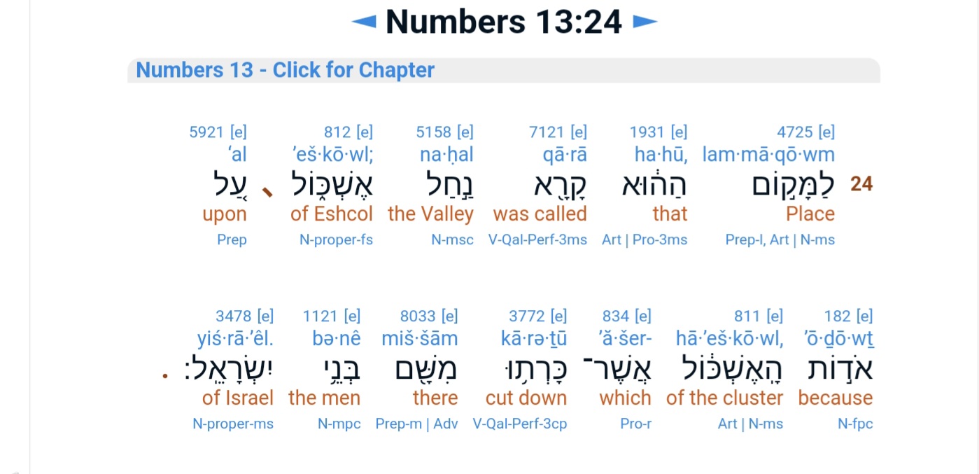 לַמָּקֹום הַהוּא קָרָא נַחַל אֶשְׁכֹּול עַל אֹדֹות הָאֶשְׁכֹּול אֲשֶׁר־כָּרְתוּ מִשָּׁם בְּנֵי יִשְׂרָאֵל׃