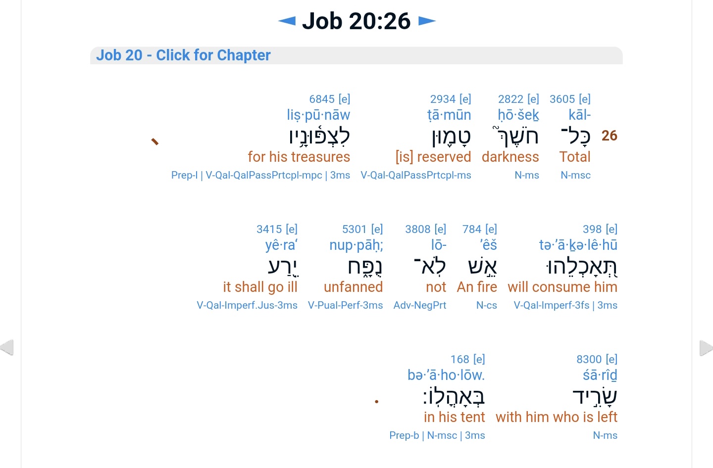 כָּל־חֹשֶׁךְ טָמוּן לִצְפּוּנָיו* תְּאָכְלֵהוּ אֵשׁ לֹא־נֻפָּח יֵרַע שָׂרִיד בְּאָהֳלֹו׃
