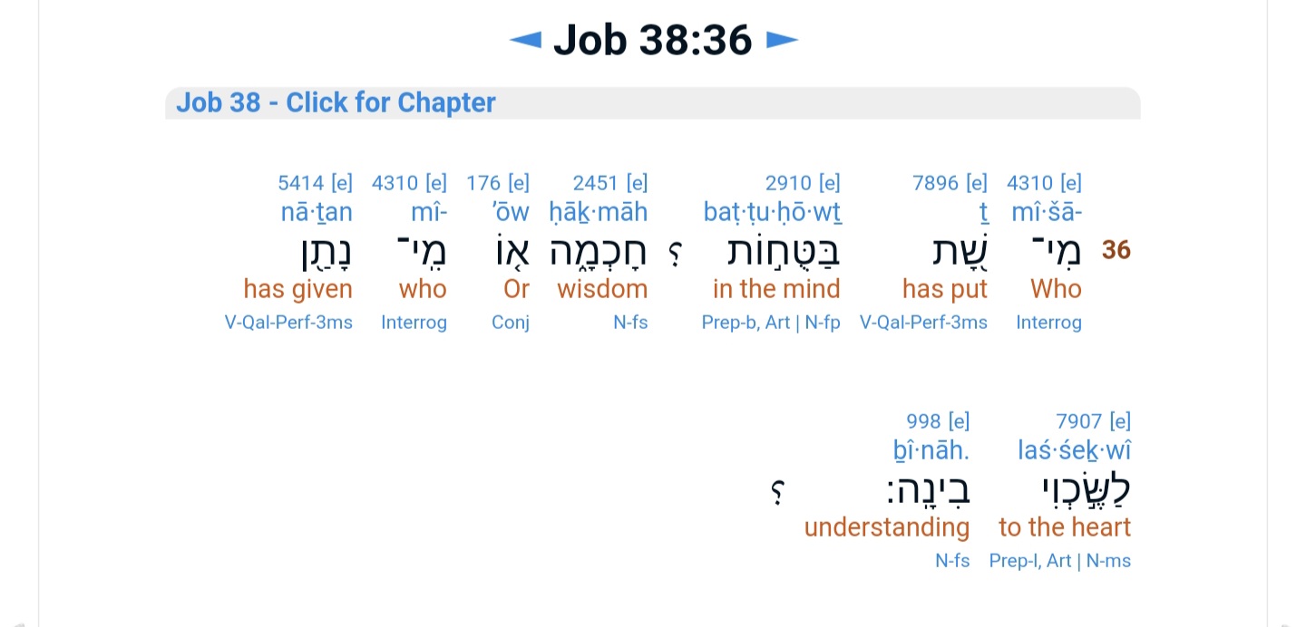 מִי־שָׁת בַּטֻּחֹות חָכְמָה אֹו מִי־נָתַן לַשֶּׂכְוִי בִינָה׃