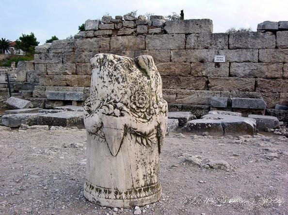위의 사진을 보면, 유적지 벽면에 BHMA / BEMA 라고 표찰을 써놓았다. 베마(BEMA)란, 문자적 의미로는 높은 계단인데, 총독이 연설할 때나 재판할 때 사람들을 내려다볼 수 있도록, 돌로 만든 일종의 계단인데 약 5m 높이에 좌우 폭은 15m에 이른다. 바로 이 자리가, 2차 전도여행 때에 사도바울이 많은 고린도 시민들을 모아놓고 설교하던 무대였으며, 이 지역 유대인들이 “예수가 그리스도”라고 설교하던 바울을 끌고 가서 세웠던 자리이며, 이에 로마총독 갈리오가 재판을 했던 장소이다(행18:12~16). 후에, 바로 이 베마 자리에 초대 고린도교회를 지었다고 하나, 두 번의 지진(521년, 1858년)으로 폐허가 되었고 지금은 그 기단(the stereobate, 건축물의 기초가 되는 단) 부분만이 남아 있어 초대교회 역사를 증거하고 있다. (아래사진)